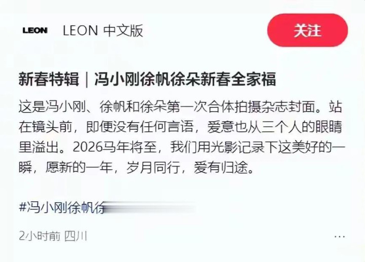 离春节越来越近,冯小刚一家也迎来了新佳音,LEON杂志晒出他们一家三口拍摄的春节全家福。一家东谈主齐穿白色式,冯朵的新造型很漂亮,不少网友夸冯朵这身打扮很像王楚然。