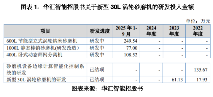 招股书骄贵,2022—2023年,华汇智能“新式30L涡轮砂磨机”的研发过问金额分手为17.93万元、61.13万元且已结项,且在招股书中,华汇智能暗示,论说期内(2022—2025年前三季度),公司研发过问一起计入研发用度,不存在研发支拨本钱化的情形。